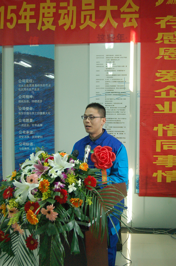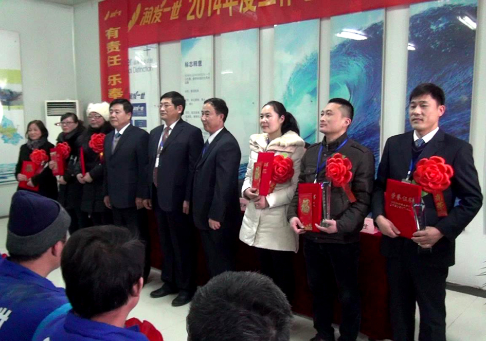 会议由工会主席周继生主持,姜桂洲助理总经理作了2014年度工作总结和2015年度工作计划的报告,喻继奎助理总经理宣读了《关于表彰2014年度优秀团队和个人的决定》,公司总经理艾明亮先生等领导分别为优秀团队、优秀管理者、优秀员工、营销标兵、优秀经销商、优秀驾驶员等集体和个人颁发了荣誉证书,奖杯,锦旗,铜牌,优秀员工代表王昌伟,优秀管理者代表品控部部长马闯,优秀经销商代表孟凡喜在大会上做了精彩的发言。大会紧紧围绕“有责任,乐奉献,同担共享,存感恩,爱企业,惜同事情”的主题,在隆重、热烈、欢快的气氛中进行,与会员工和经销商朋友深受教育和鼓舞,大家纷纷表示,努力工作,团结一心,同舟共济,共创润发一世美好明天。